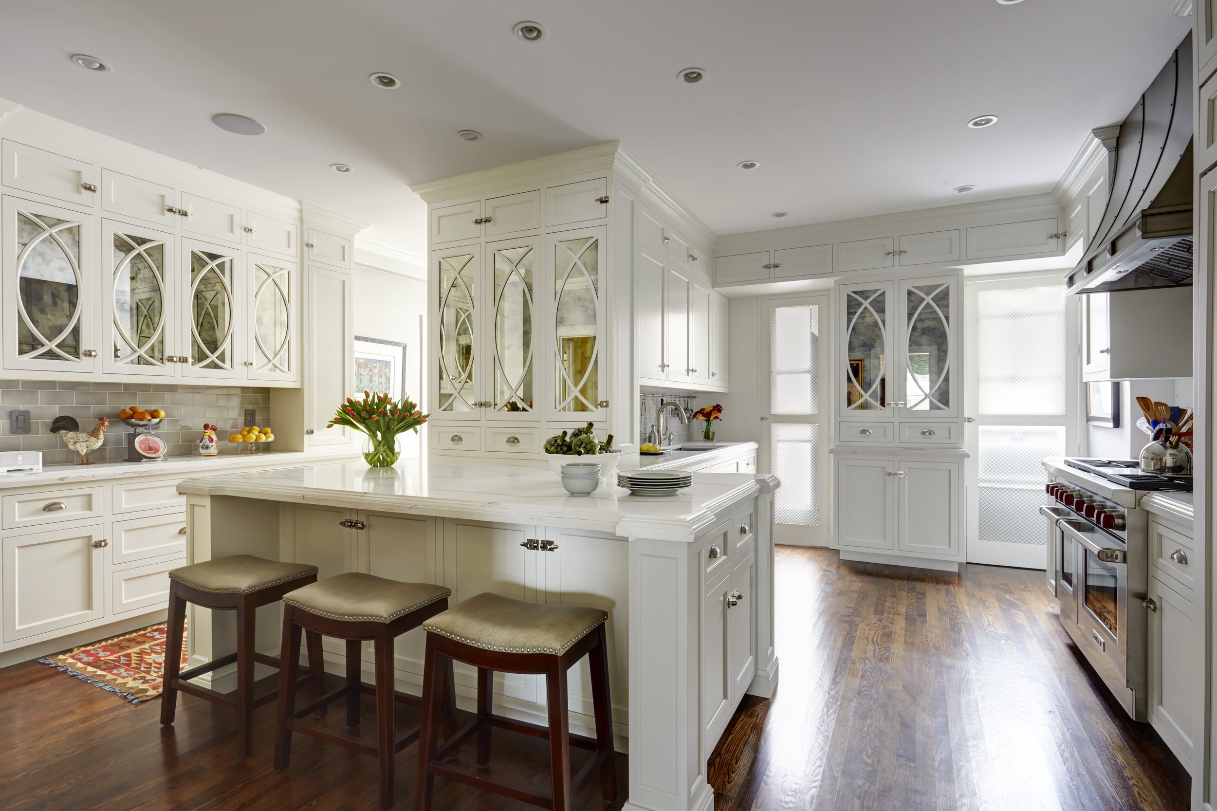 Designed, built and installed face frame construction and Calacatta marble countertops, bronzed stove hood, bin pulls, ice box hinges, mirrored door and curved mullions.