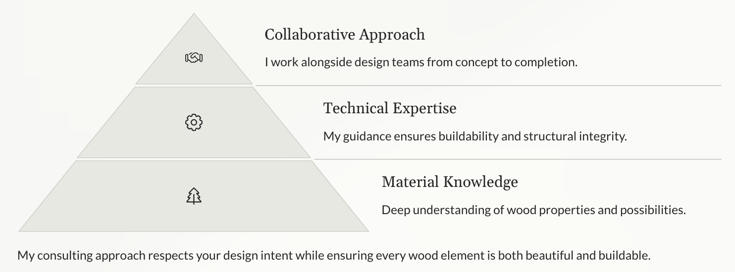 I partner with architects, interior designers, manufacturers, and brokers to bring deep woodworking knowledge into every phase of a project. With over forty years of hands-on experience, I help teams make informed, craft-conscious decisions that align design intent, structural integrity, functional hardware, and appropriate finishes — for both one-of-a-kind commissions and large-scale production.
